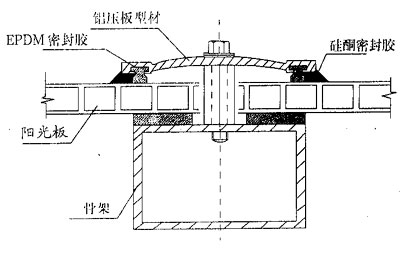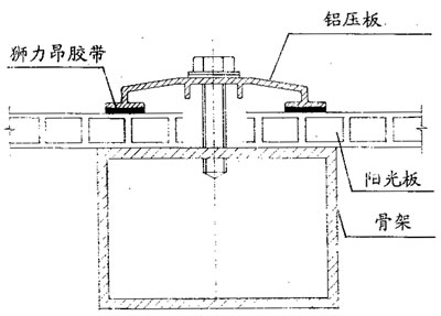 這種裝配系統(tǒng)主要用于小型的設(shè)施,如汽車庫、車站篷、雨檐、溫室以及其它許多替代玻璃的場合。當采用濕式裝配法,如下圖2所示基本要求是密封系統(tǒng)要能承受板材一定量的移動,允許熱膨脹而不降低其與框架及板材之間的粘結(jié)力。一般推薦使用中性硅酮膠與中空陽光板的濕式 裝配,但要特別注意,在使用前必須檢查所用密封膠的化學性,絕對不可選用酸性及堿性硅酮膠,因為這些固化劑會導致板材龜裂,尤其當有內(nèi)應(yīng)力時,在選用密封膠時,除考慮化學適性外,還要重點檢驗,延伸度及耐候性等。