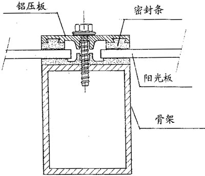 (1)在連接型材中或在鑲框的鑲槽中必須留出有效的空間以便板材受膨脹和受載位移。中空陽光板的線性熱膨脹系數(shù)是7×10m/m.k,即溫度每升高1℃,1m×1m板順著長度方向各膨脹0.075mm,用戶須根據(jù)工程所在地分四季溫差,算出安裝間隙的數(shù)據(jù):如北方地區(qū),最高溫度為40℃,最低溫度為-30℃,1m×1m的板材安裝預留間隙為0.07×70=4.9mm