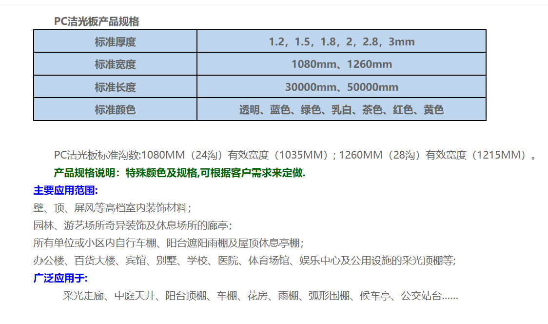 主營:PC波浪瓦、PC耐力板、PC潔光板、PC陽光板、PC雨陽蓬、PC壓條、PC配件,承接任何塑料工藝成型深加工,昊塑板材具有:抗紫外線、耐老化、抗沖擊、隔音、隔熱、難燃等優(yōu)異性能,成為樓頂采光、高速公路隔音、燈箱廣告、候車廳、家居陽臺等的不錯(cuò)之選。